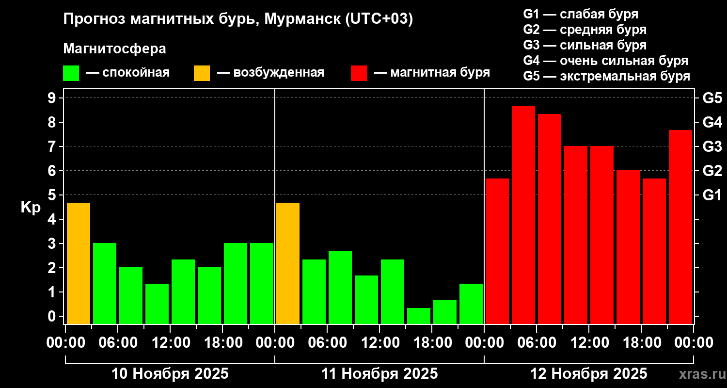 Прогноз магнитных бурь в Мурманске — 10 ноября 2025 года