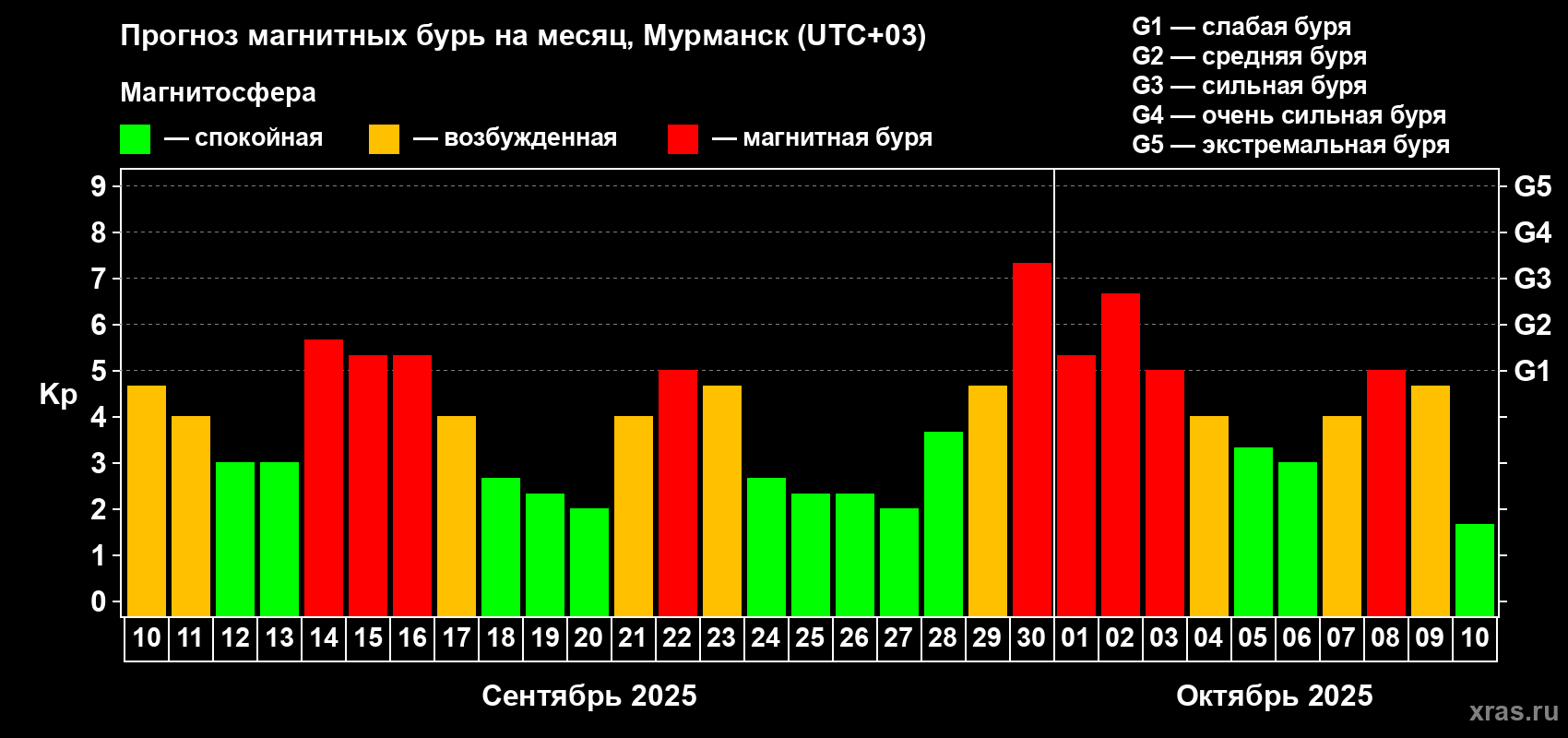 Прогноз магнитных бурь в Мурманске на 10 сентября 2025 года