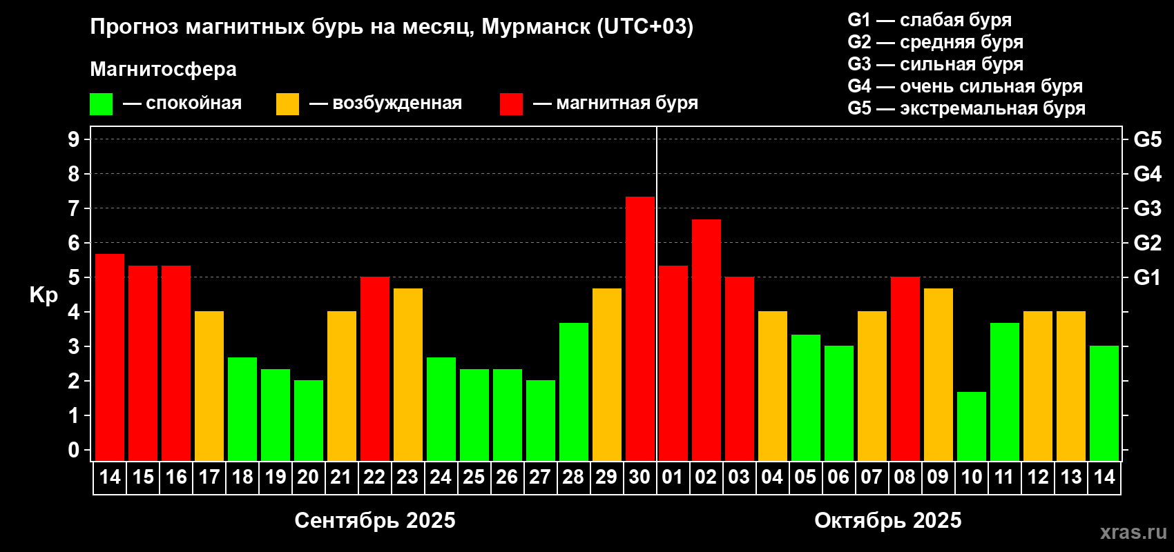Прогноз магнитных бурь в Мурманске на 14 сентября 2025 года