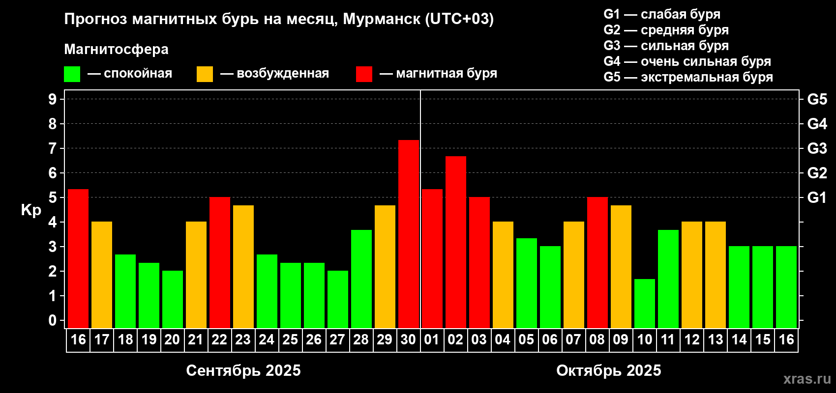 Прогноз магнитных бурь в Мурманске на 16 сентября 2025 года