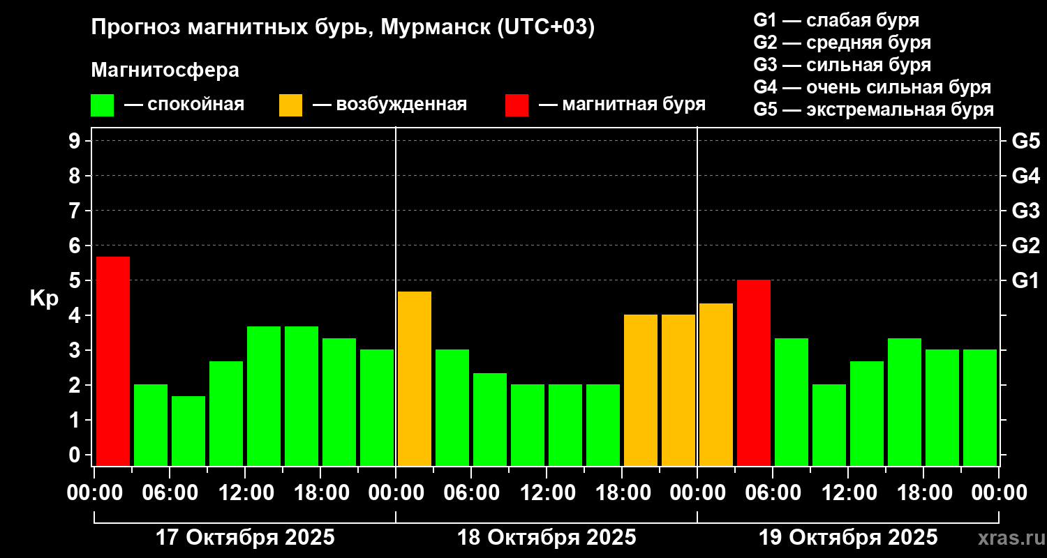 Прогноз магнитных бурь в Мурманске — 17 октября 2025 года