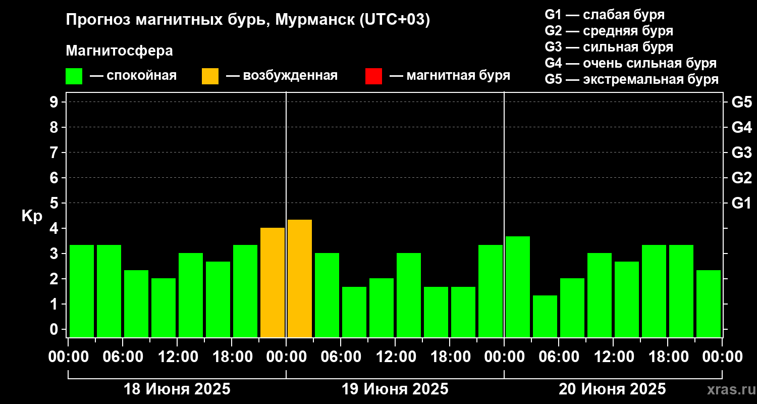 Прогноз магнитных бурь в Мурманске на 18 июня 2025 года