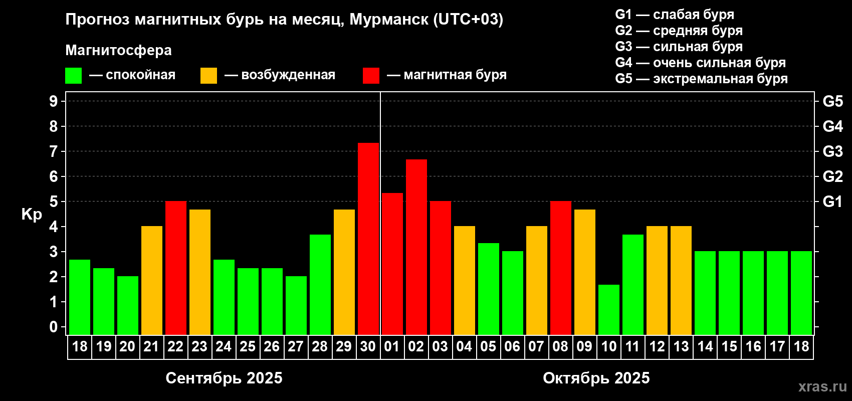 Прогноз магнитных бурь в Мурманске на 18 сентября 2025 года