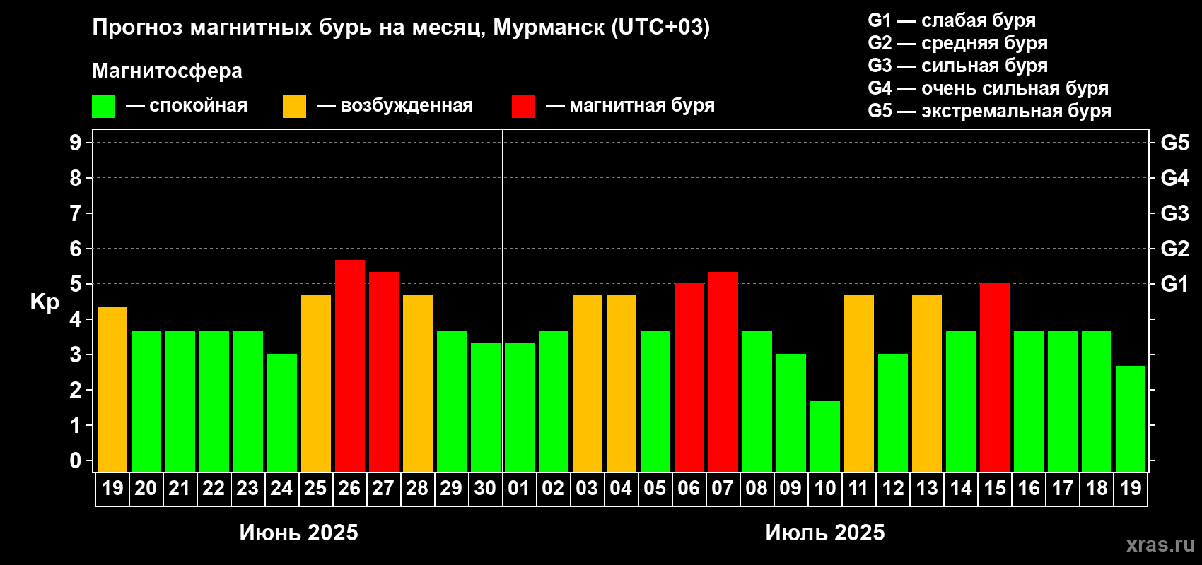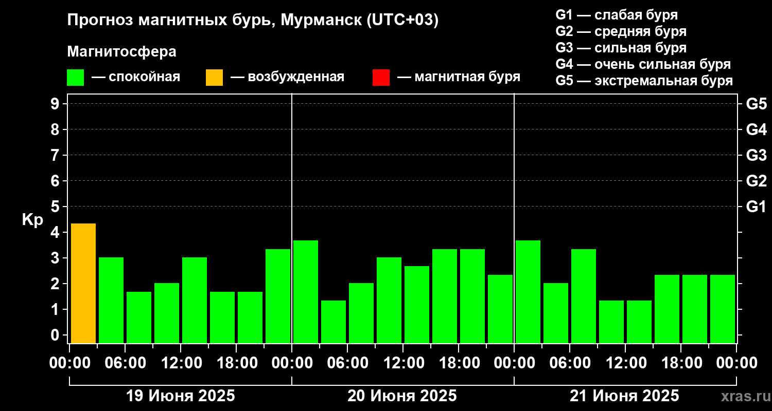 Прогноз магнитных бурь в Мурманске на 19 июня 2025 года
