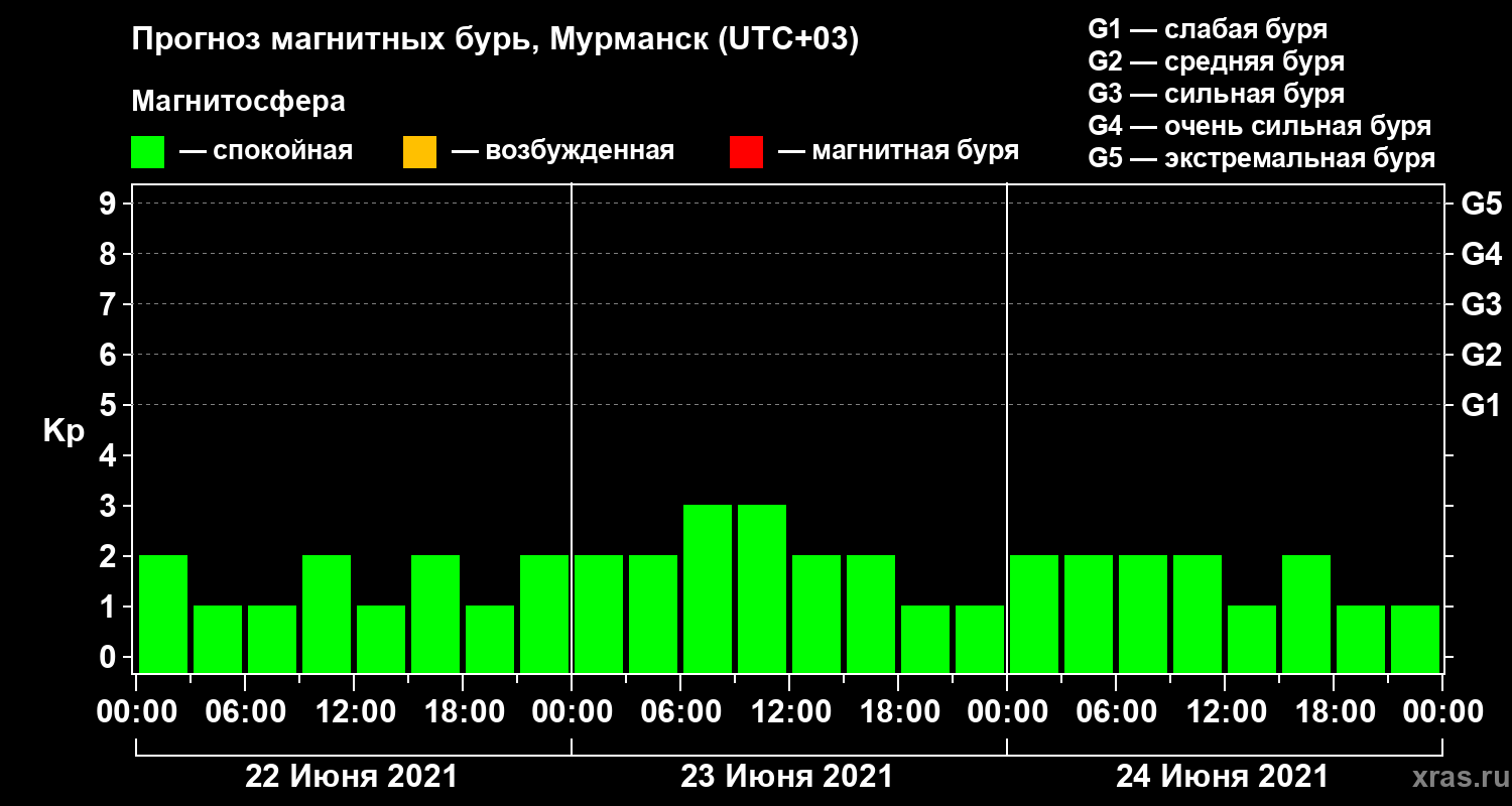 Прогноз магнитных бурь в Мурманске на 22 июня 2021 года