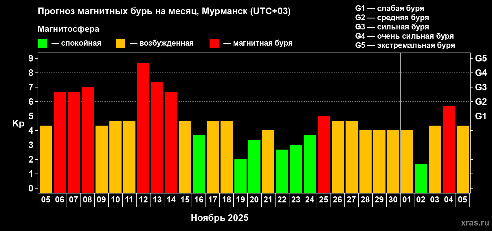 Прогноз магнитных бурь в Мурманске — 5 ноября 2025 года