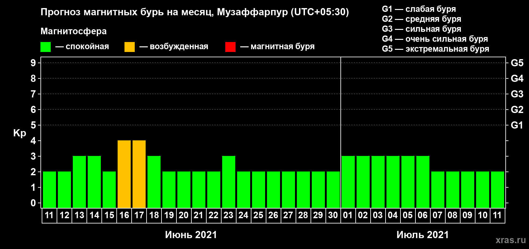 Прогноз магнитных бурь в Музаффарпуре — 11 июня 2021 года