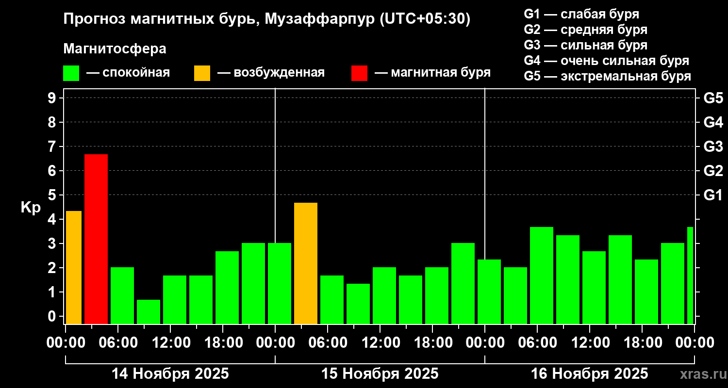 Прогноз магнитных бурь в Музаффарпуре — 14 ноября 2025 года