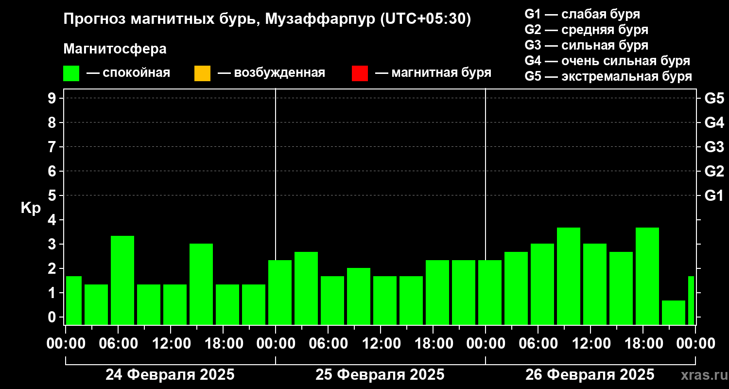 Прогноз магнитных бурь в Музаффарпуре — 24 февраля 2025 года