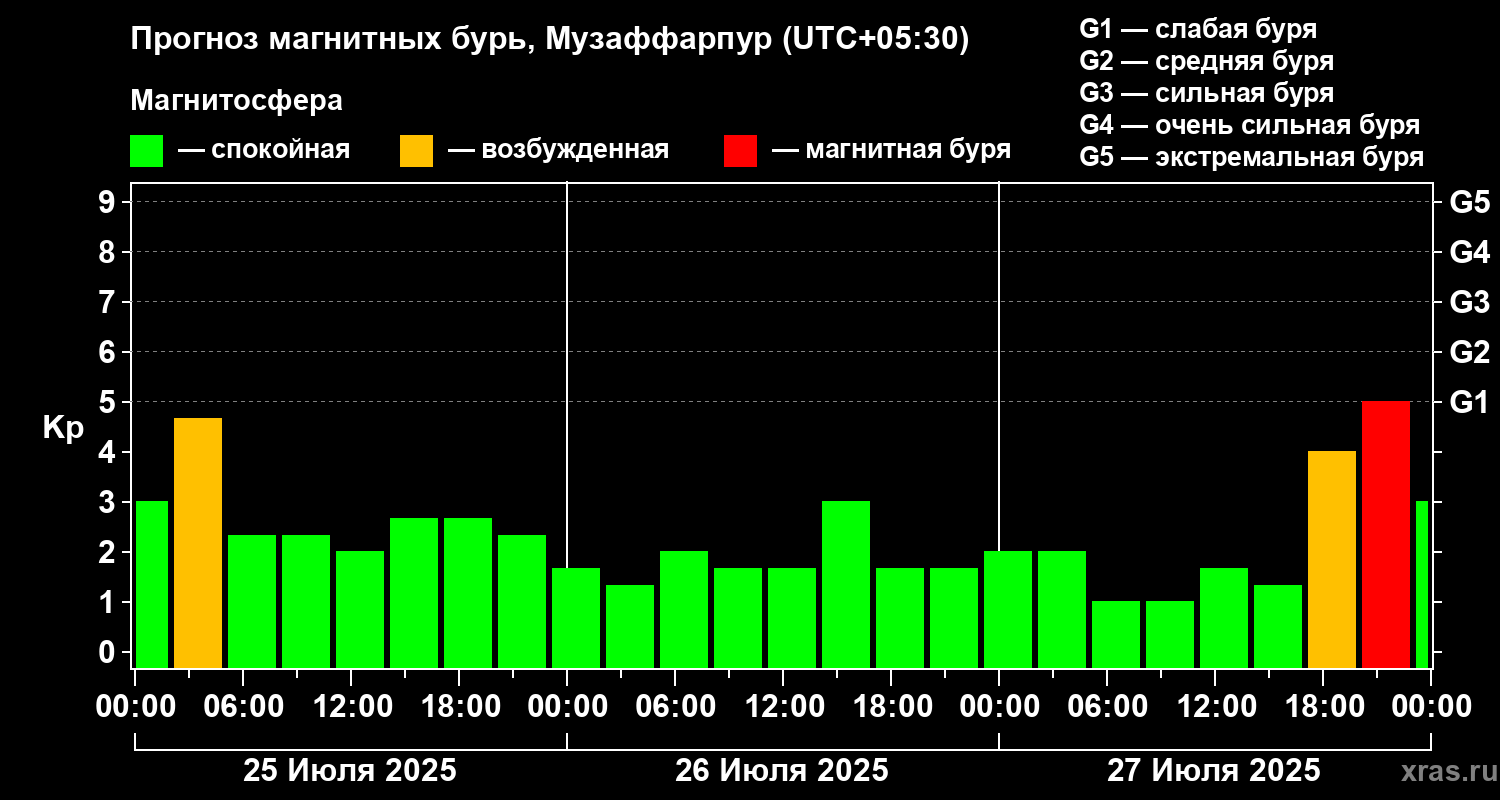 Прогноз магнитных бурь в Музаффарпуре на 25 июля 2025 года