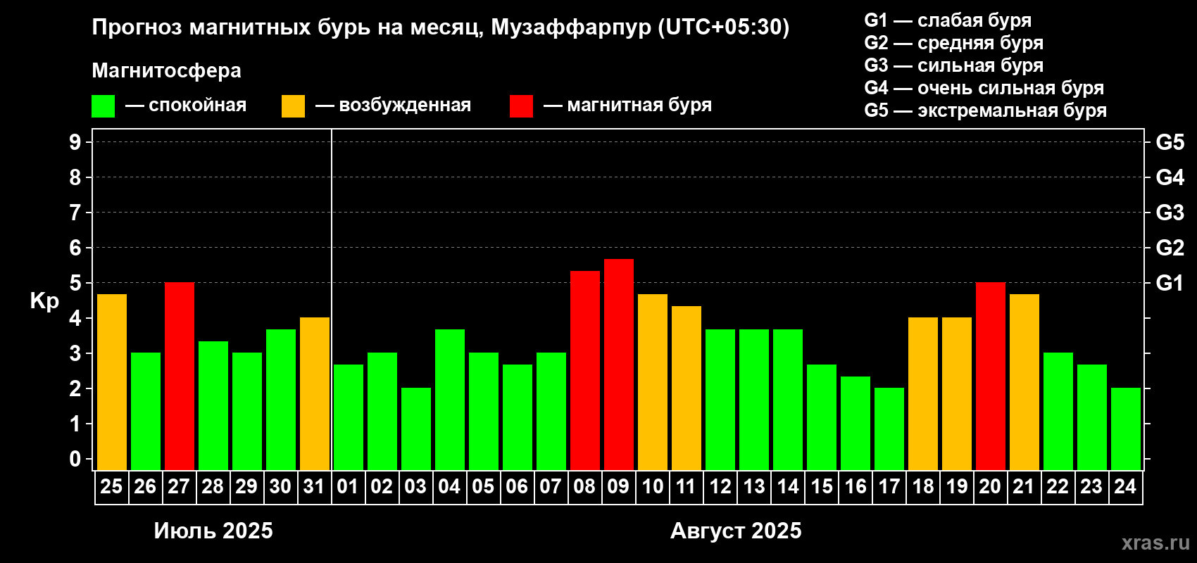 Прогноз магнитных бурь в Музаффарпуре — 25 июля 2025 года
