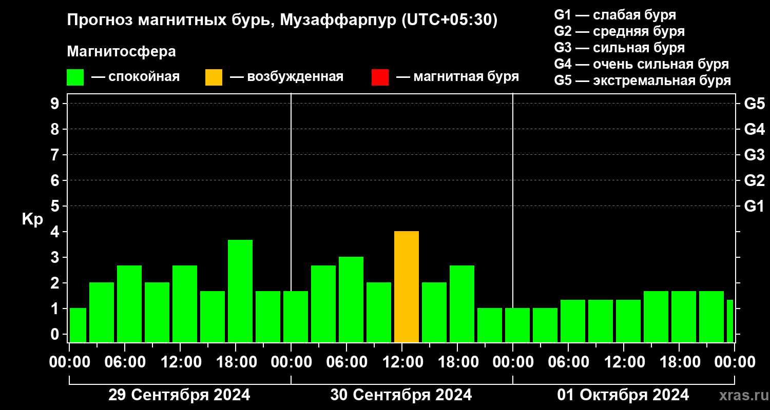 Прогноз магнитных бурь в Музаффарпуре — 29 сентября 2024 года