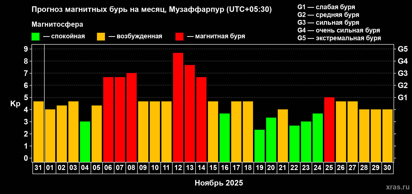 Прогноз магнитных бурь в Музаффарпуре — 31 октября 2025 года