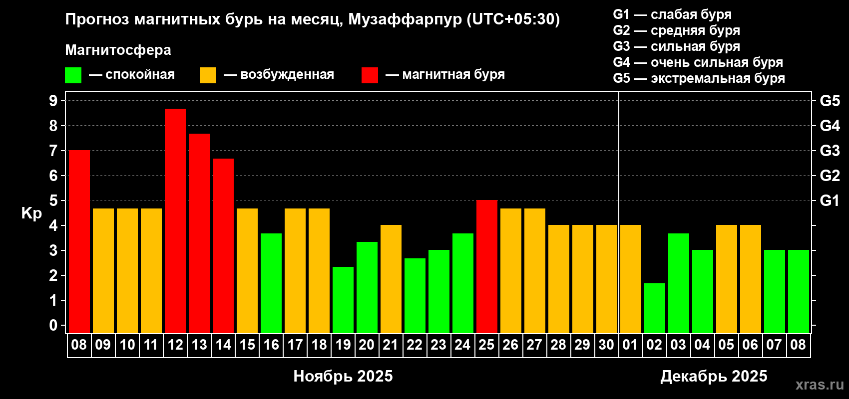 Прогноз магнитных бурь в Музаффарпуре — 8 ноября 2025 года