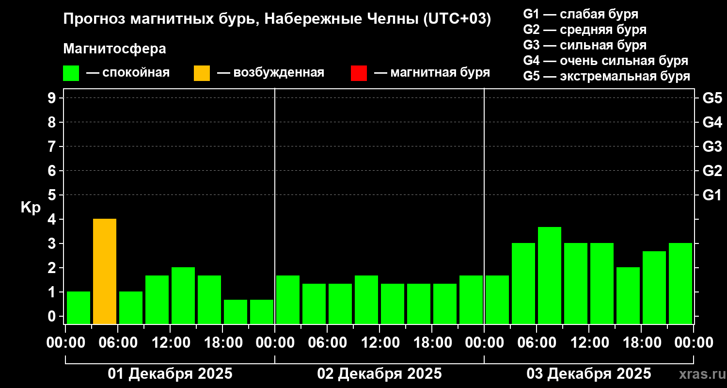 Прогноз магнитных бурь Набережных Челнах на 1 декабря 2025 года