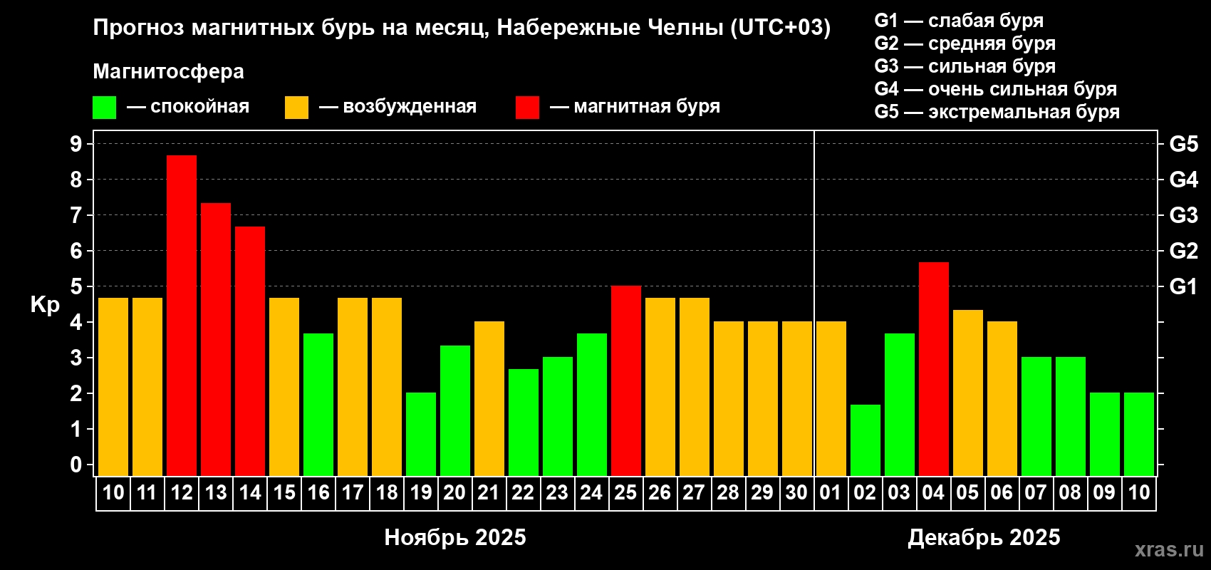 Прогноз магнитных бурь Набережных Челнах — 10 ноября 2025 года