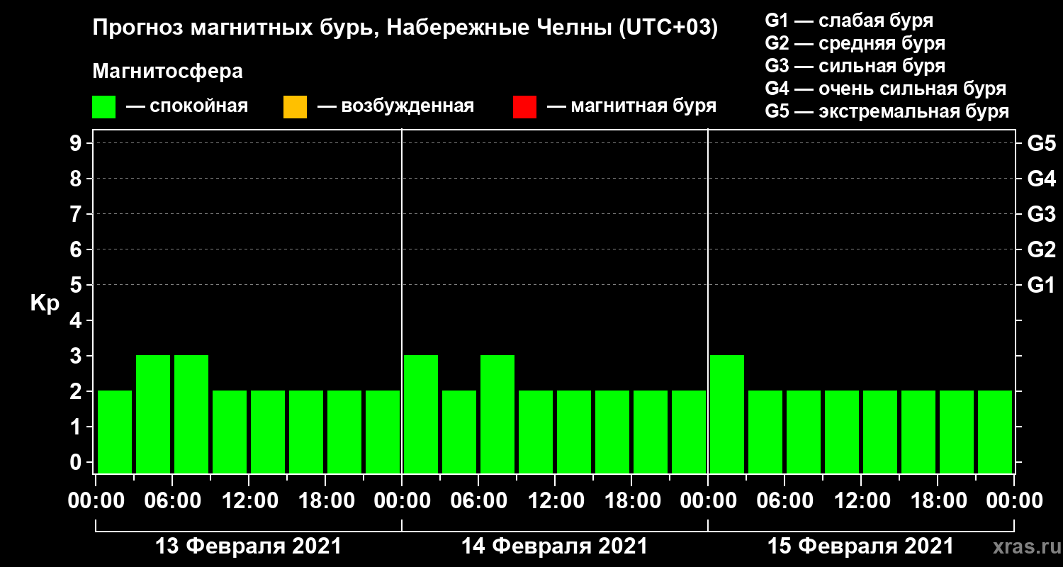Прогноз магнитных бурь Набережных Челнах на 13 февраля 2021 года