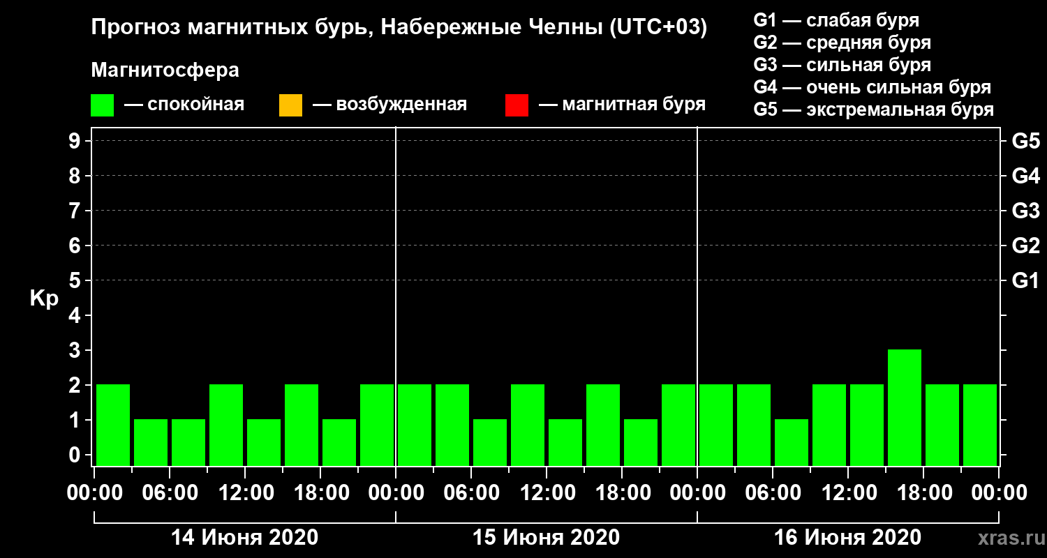 Прогноз магнитных бурь Набережных Челнах на 14 июня 2020 года
