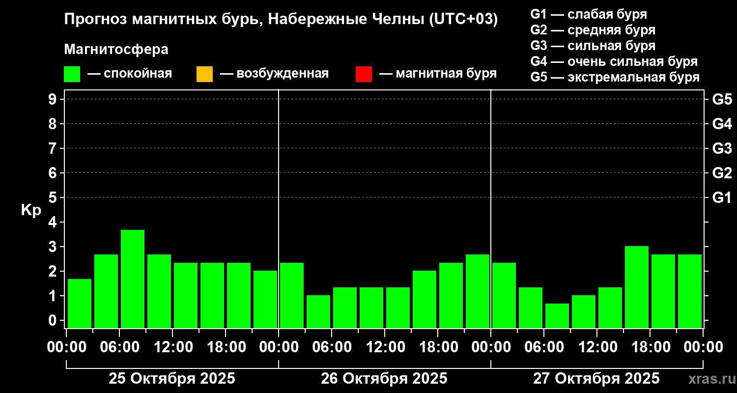 Прогноз магнитных бурь Набережных Челнах — 25 октября 2025 года