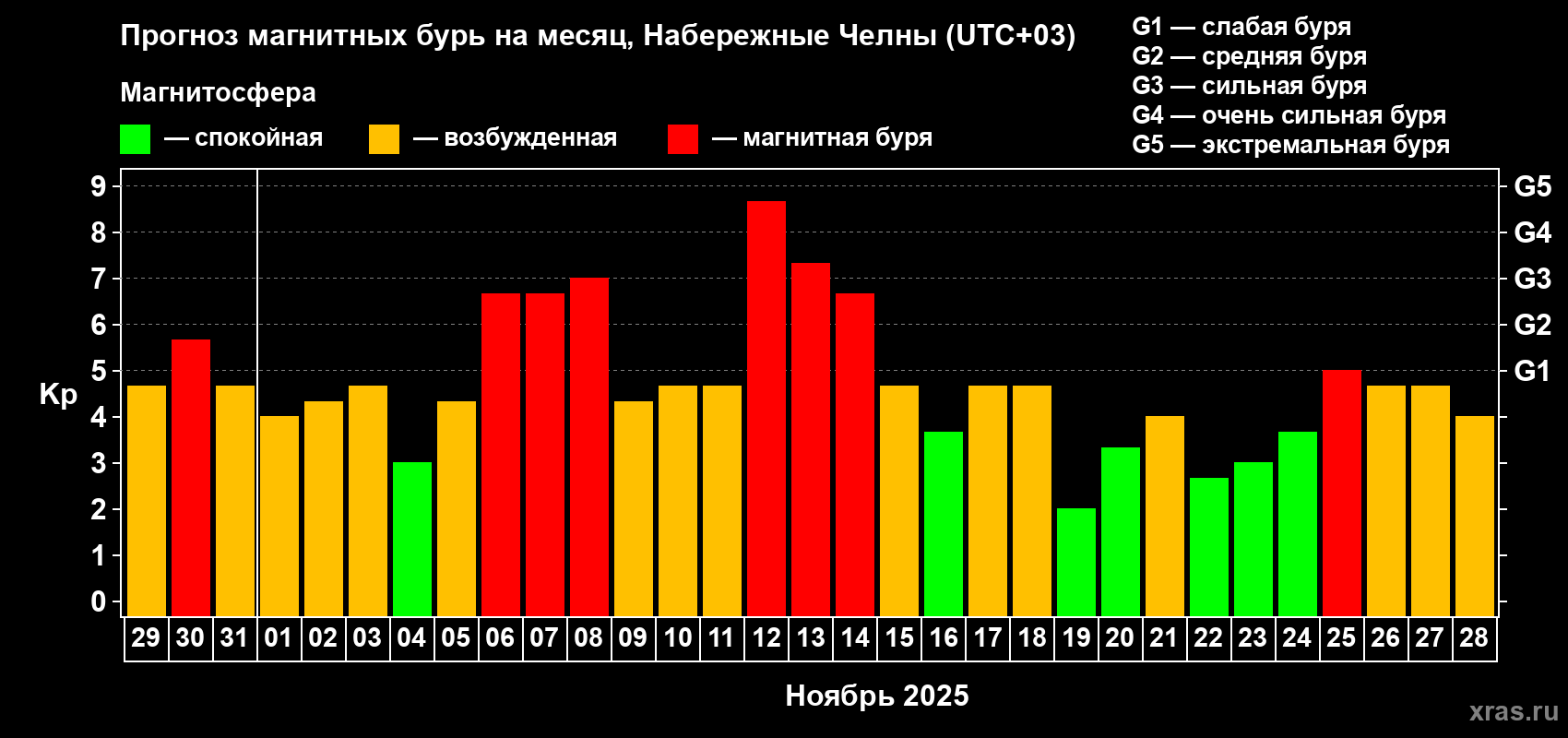 Прогноз магнитных бурь Набережных Челнах — 29 октября 2025 года
