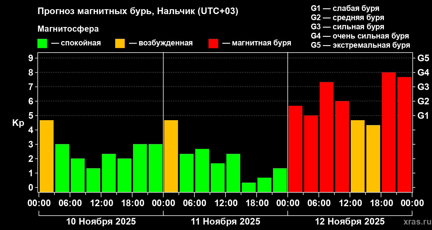 Прогноз магнитных бурь в Нальчике — 10 ноября 2025 года