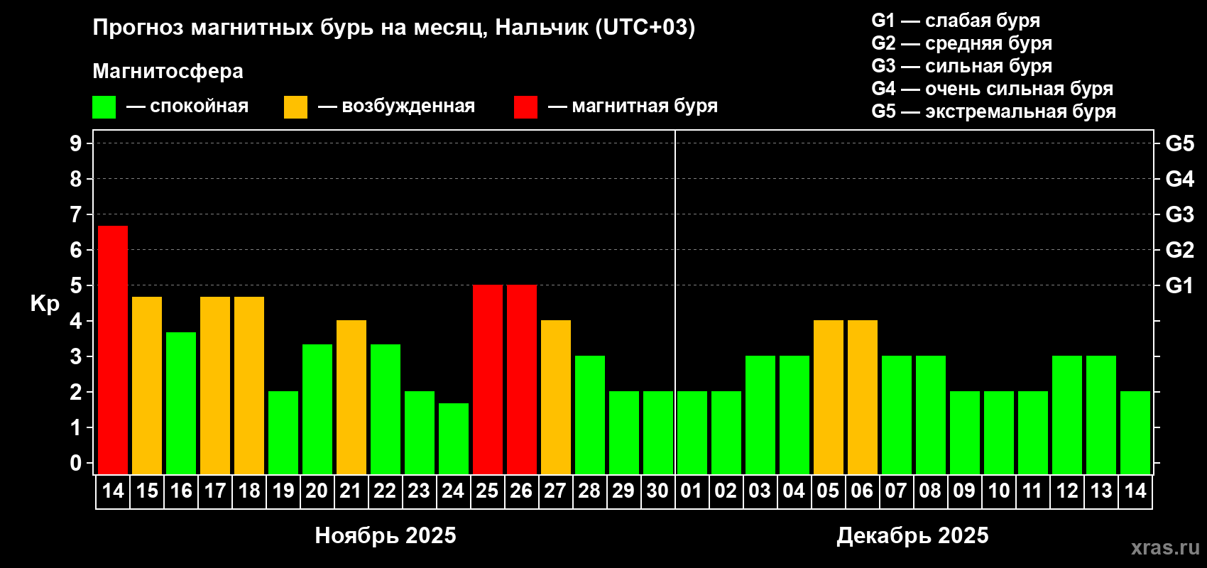 Прогноз магнитных бурь в Нальчике — 14 ноября 2025 года
