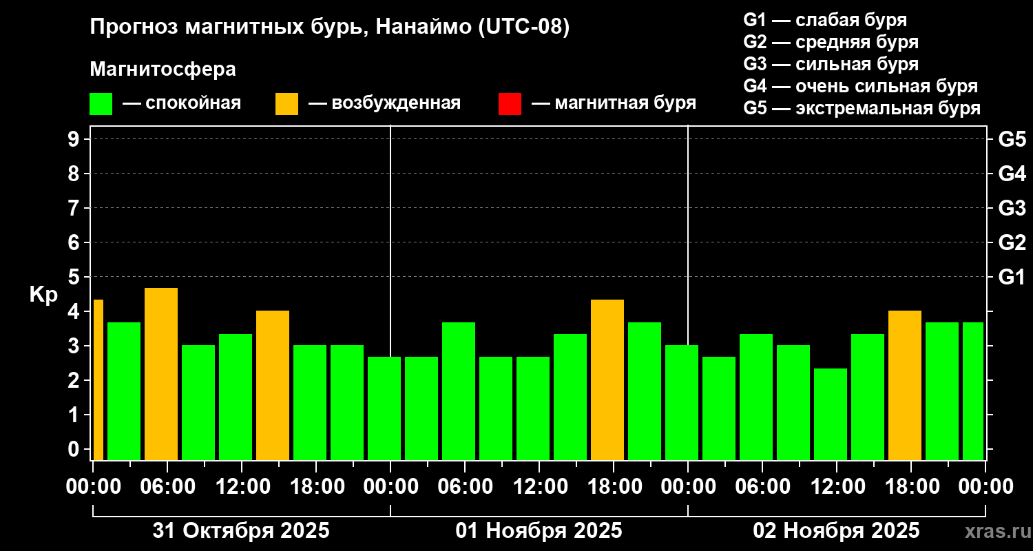 Прогноз магнитных бурь Нанаймо на 31 октября 2025 года