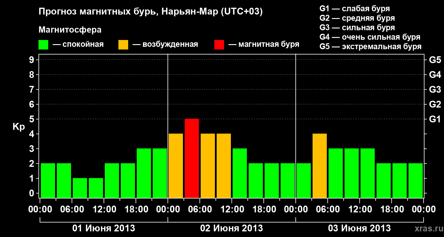 Прогноз магнитных бурь в Нарьян-Маре на 1 июня 2013 года
