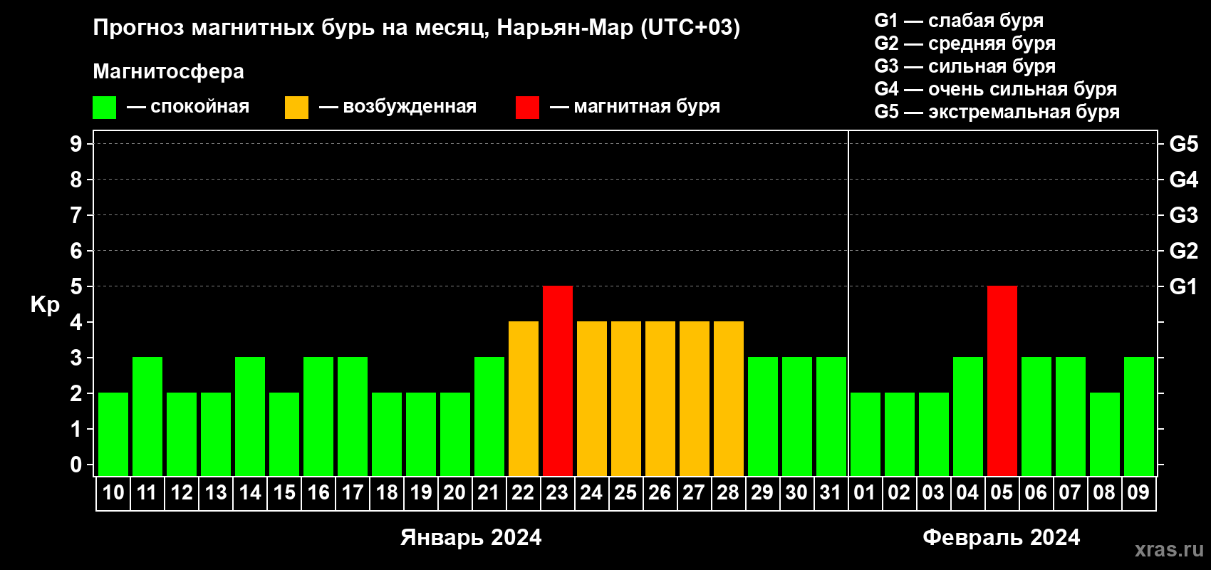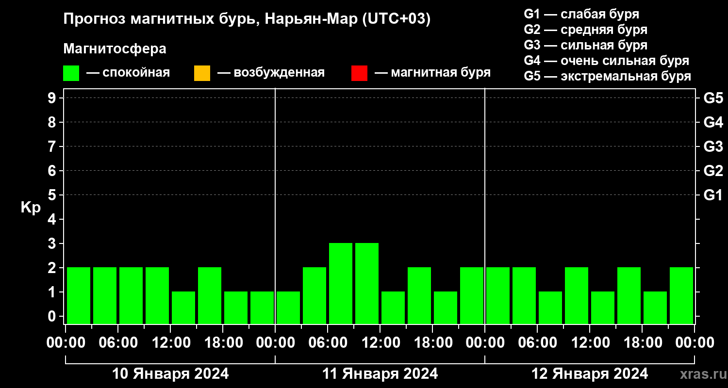 Прогноз магнитных бурь в Нарьян-Маре на 10 января 2024 года