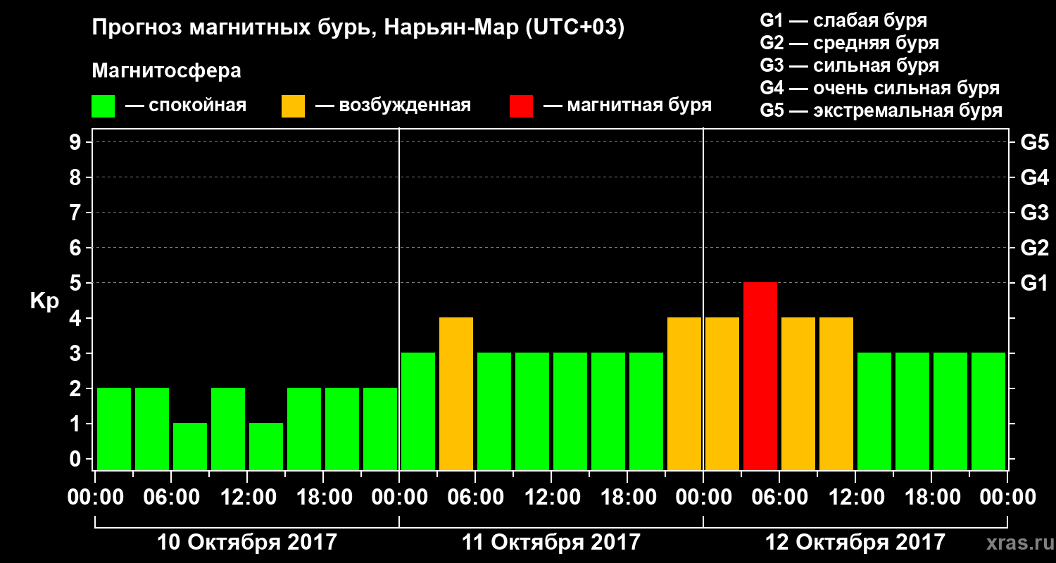 Прогноз магнитных бурь в Нарьян-Маре на 10 октября 2017 года