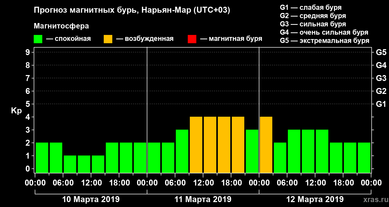 Прогноз магнитных бурь в Нарьян-Маре на 10 марта 2019 года