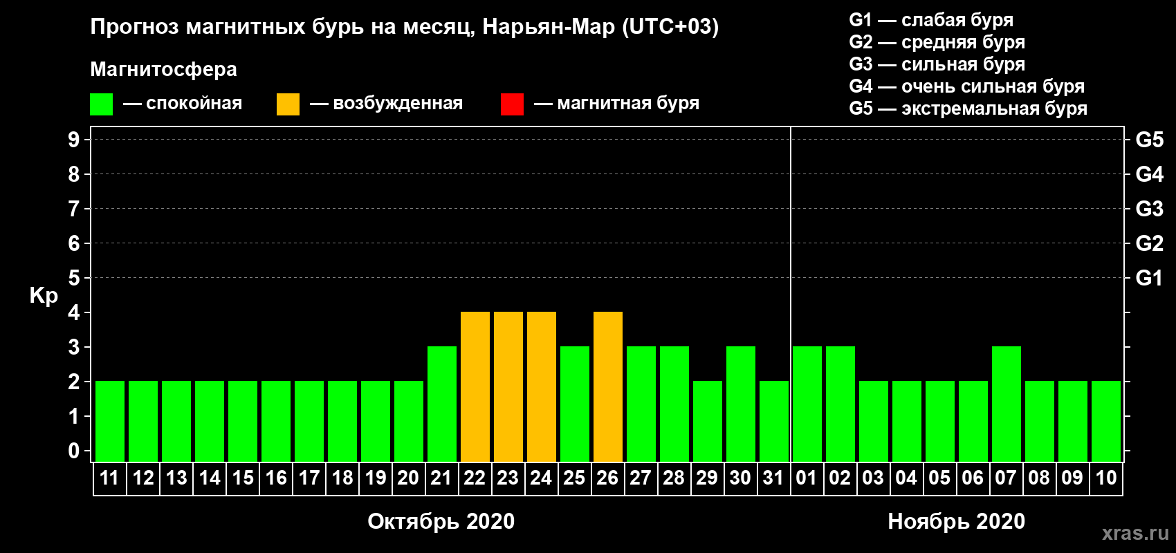 Прогноз магнитных бурь в Нарьян-Маре на 11 октября 2020 года