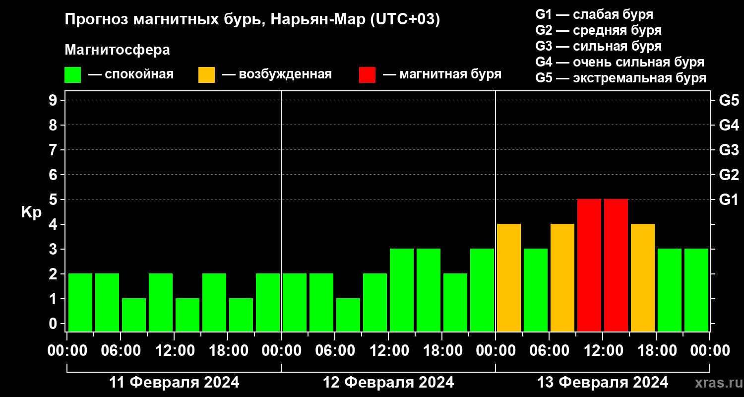 Прогноз магнитных бурь в Нарьян-Маре на 11 февраля 2024 года