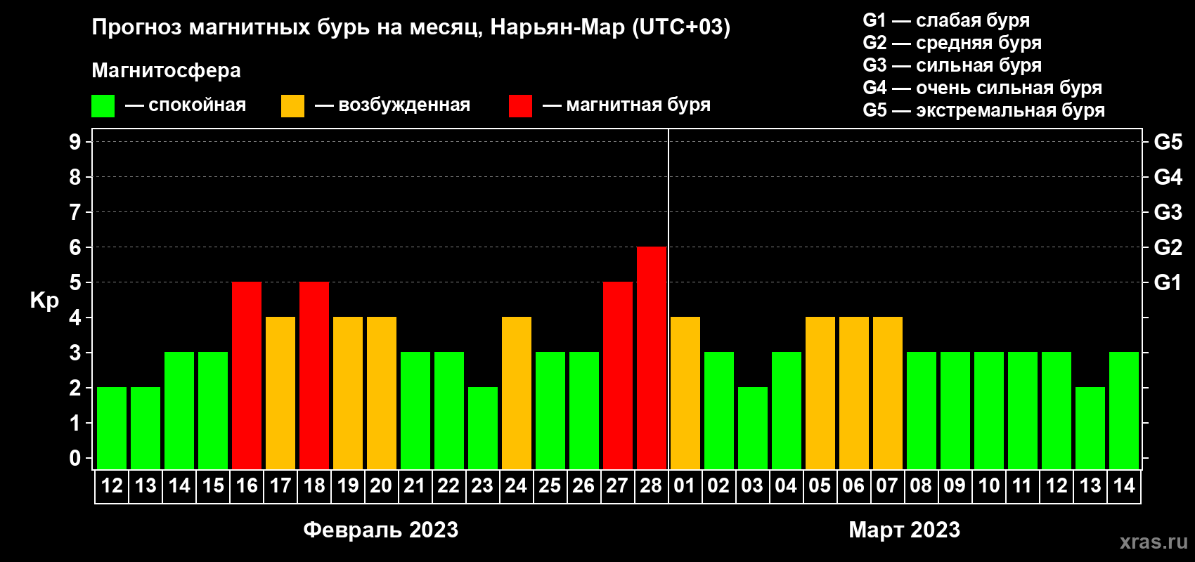 Прогноз магнитных бурь в Нарьян-Маре на 12 февраля 2023 года