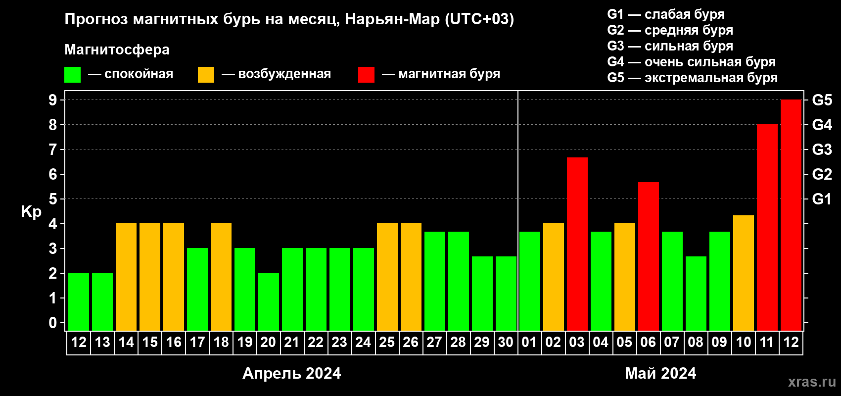 Прогноз магнитных бурь в Нарьян-Маре — 12 апреля 2024 года