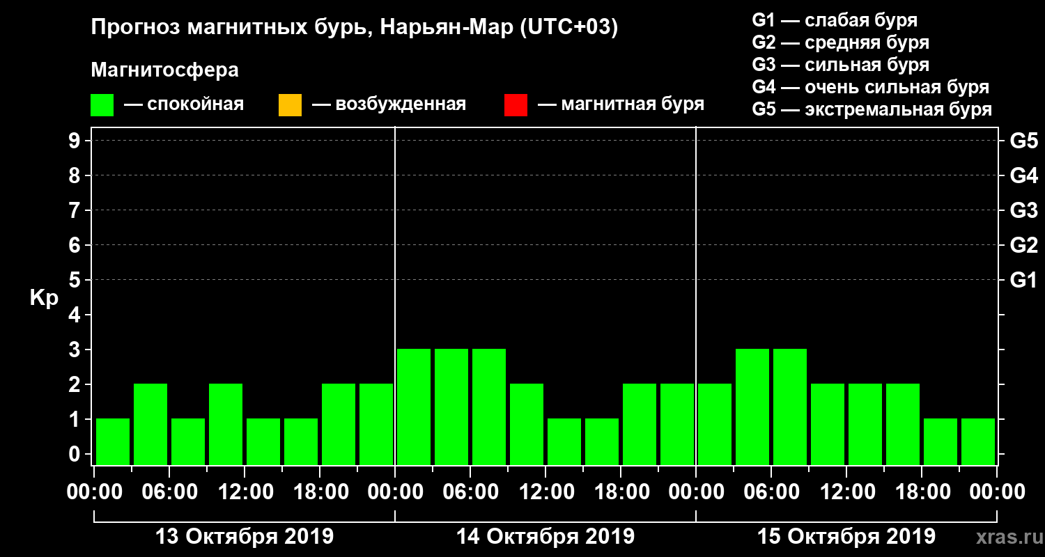 Прогноз магнитных бурь в Нарьян-Маре на 13 октября 2019 года