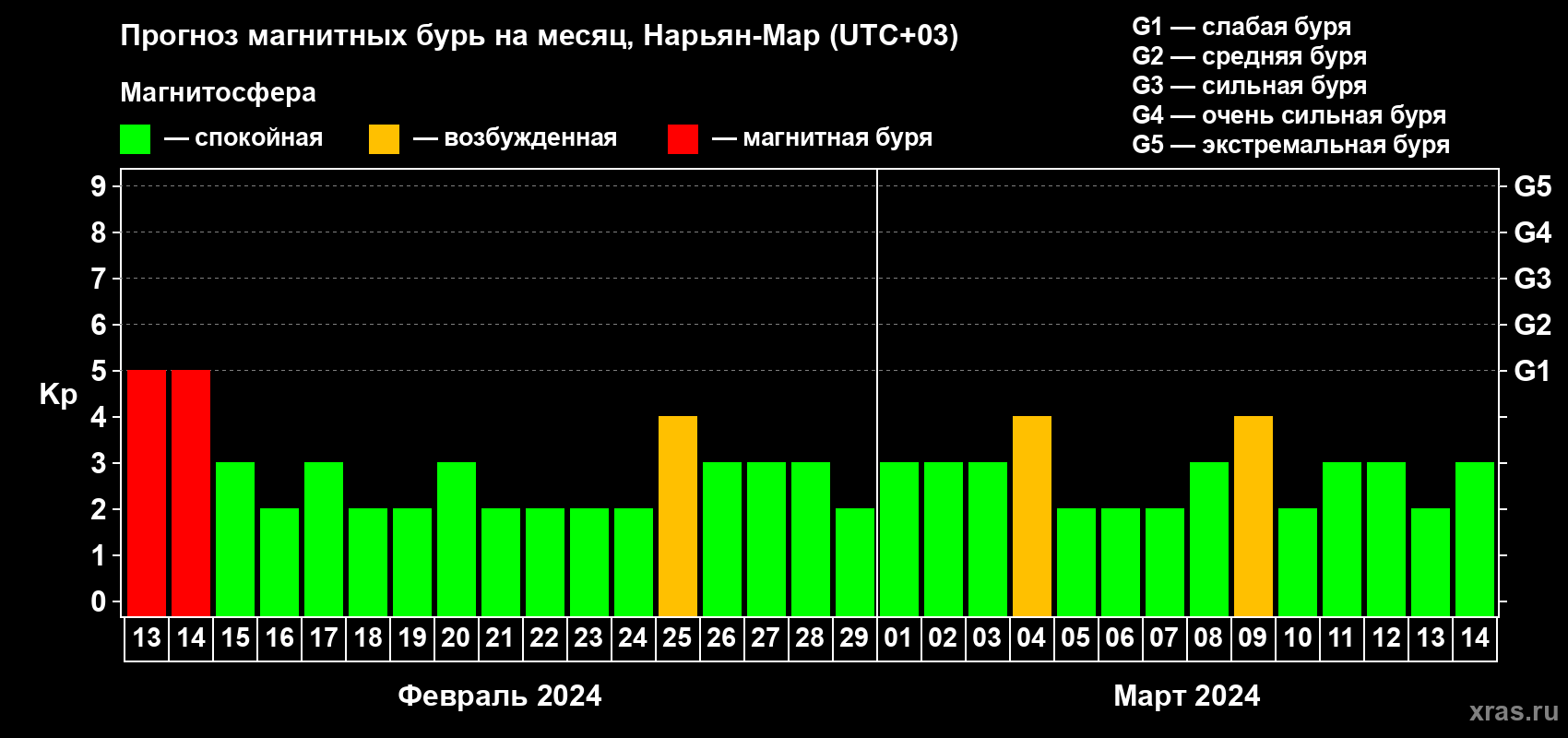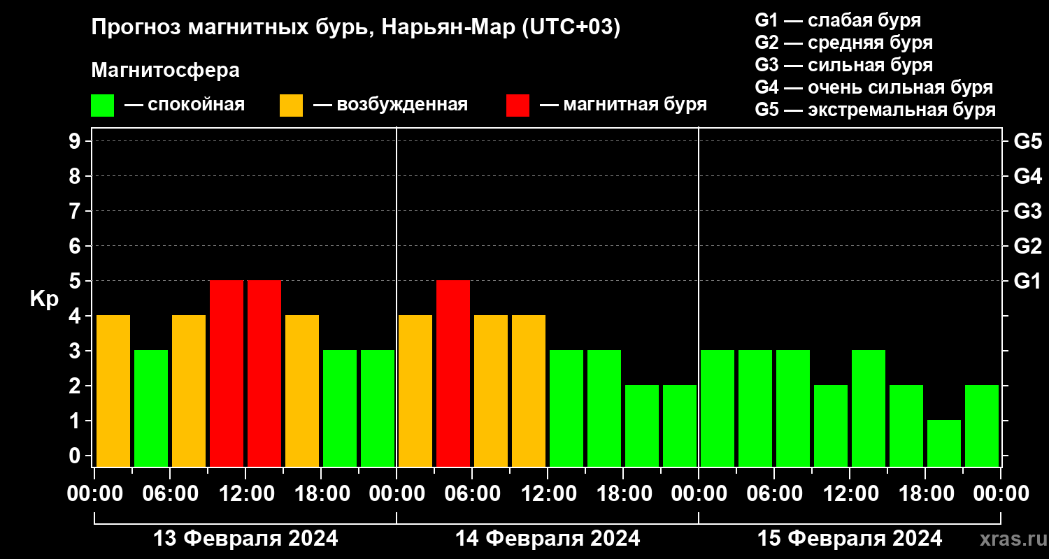 Прогноз магнитных бурь в Нарьян-Маре на 13 февраля 2024 года