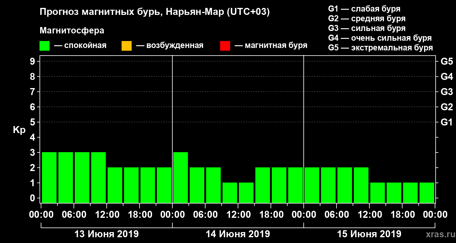 Прогноз магнитных бурь в Нарьян-Маре на 13 июня 2019 года