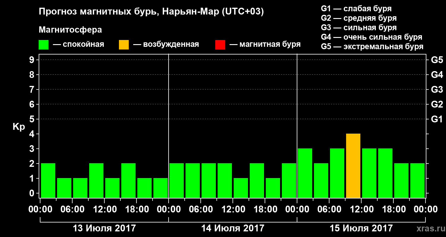 Прогноз магнитных бурь в Нарьян-Маре на 13 июля 2017 года
