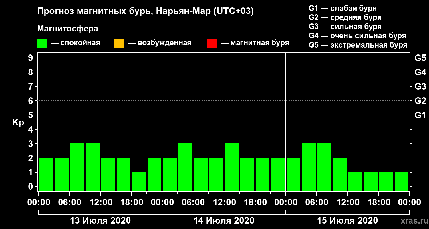Прогноз магнитных бурь в Нарьян-Маре на 13 июля 2020 года