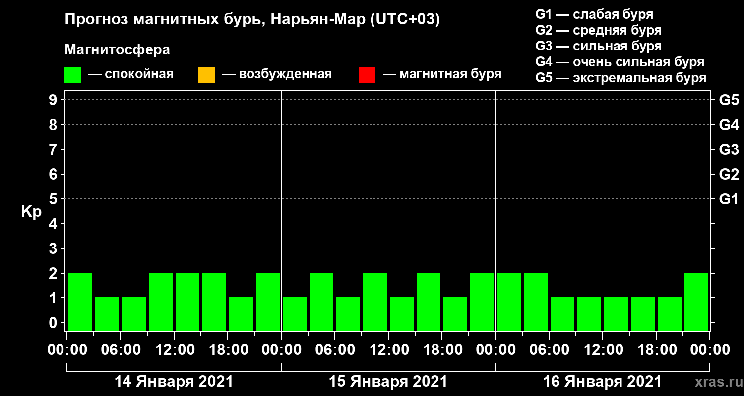 Прогноз магнитных бурь в Нарьян-Маре на 14 января 2021 года
