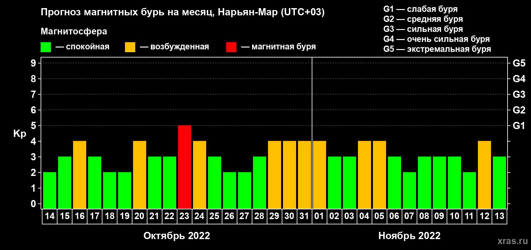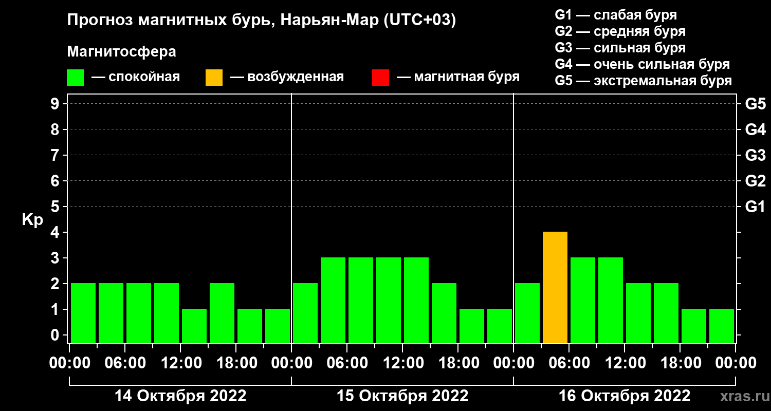 Прогноз магнитных бурь в Нарьян-Маре на 14 октября 2022 года