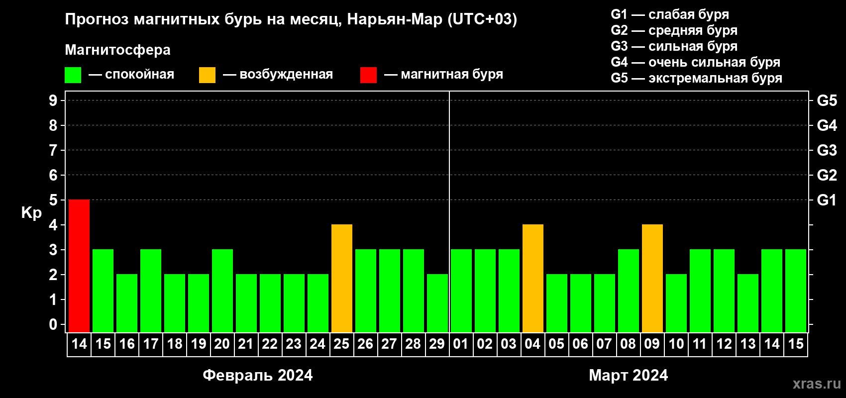 Прогноз магнитных бурь в Нарьян-Маре — 14 февраля 2024 года