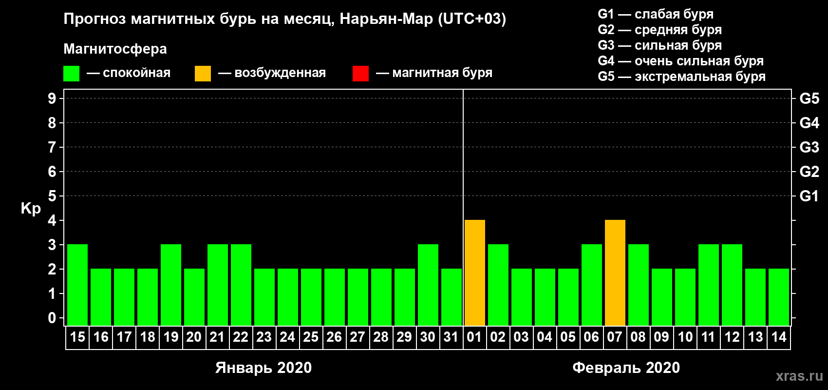 Прогноз магнитных бурь в Нарьян-Маре на 15 января 2020 года