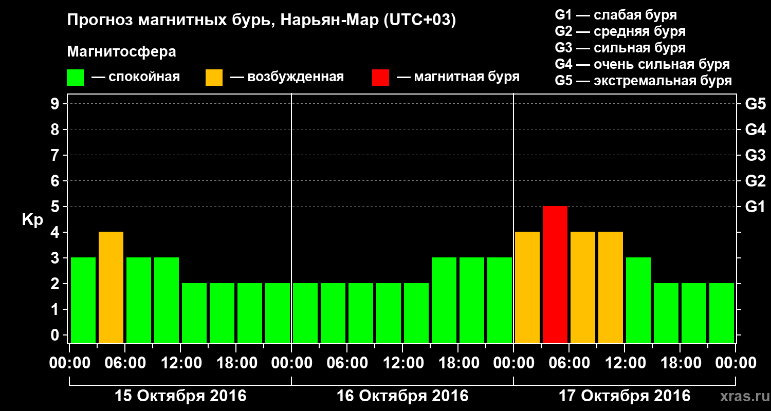 Прогноз магнитных бурь в Нарьян-Маре на 15 октября 2016 года