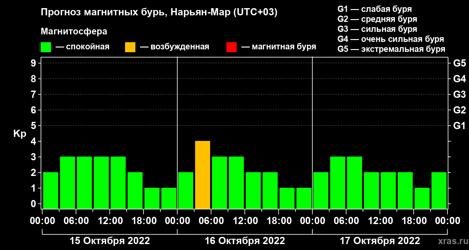 Прогноз магнитных бурь в Нарьян-Маре на 15 октября 2022 года