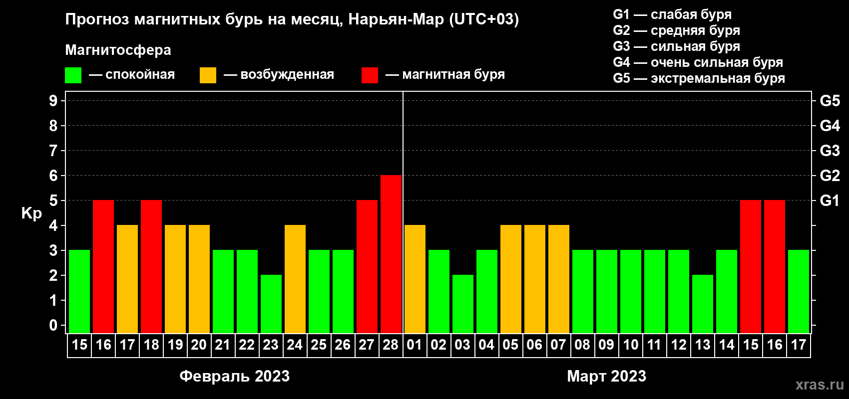 Прогноз магнитных бурь в Нарьян-Маре на 15 февраля 2023 года
