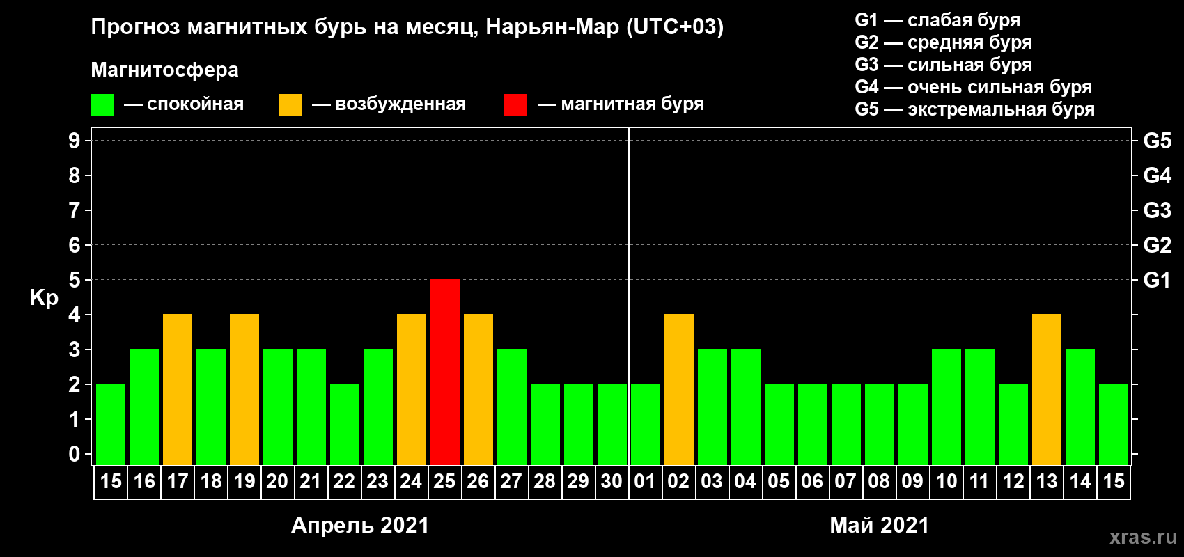 Прогноз магнитных бурь в Нарьян-Маре на 15 апреля 2021 года