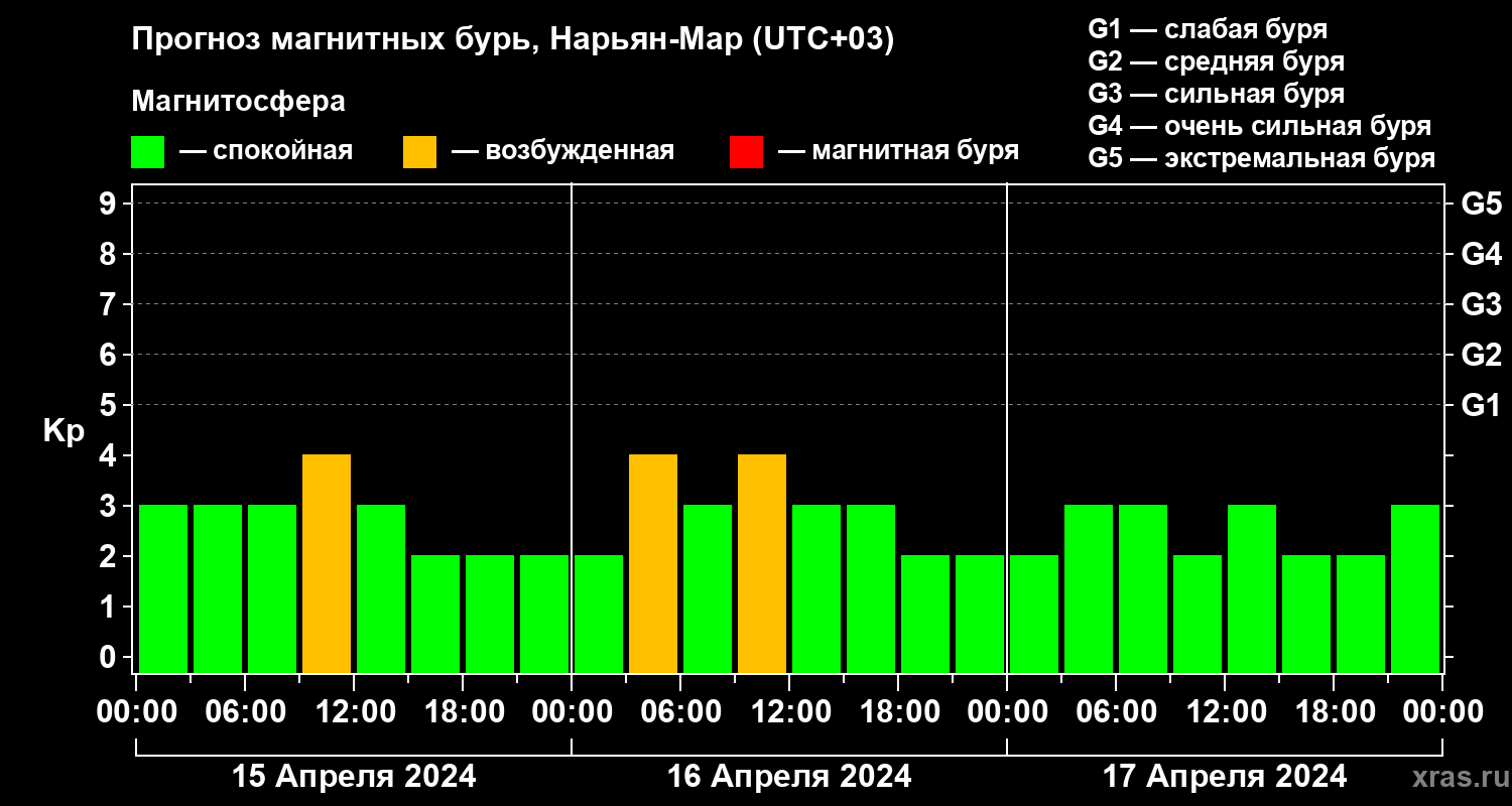 Прогноз магнитных бурь в Нарьян-Маре на 15 апреля 2024 года