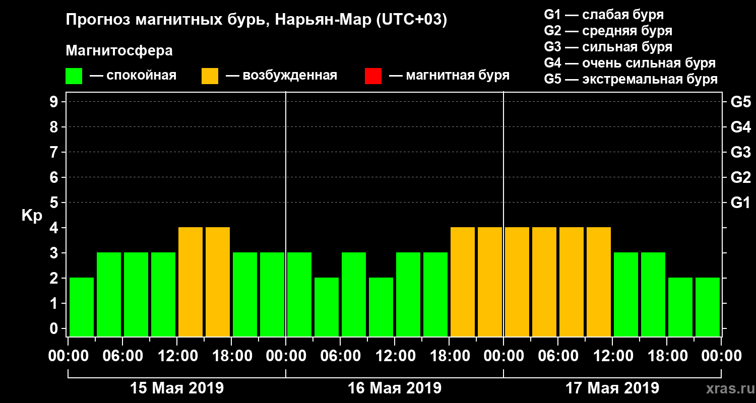 Прогноз магнитных бурь в Нарьян-Маре на 15 мая 2019 года